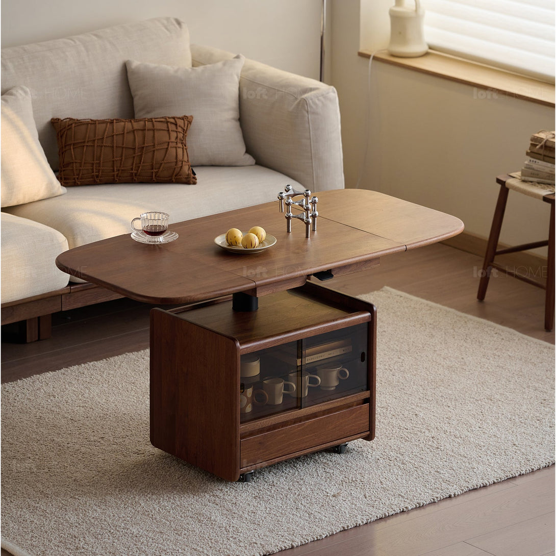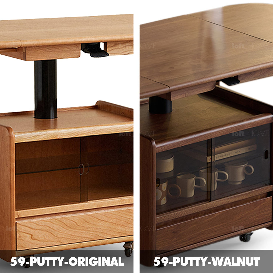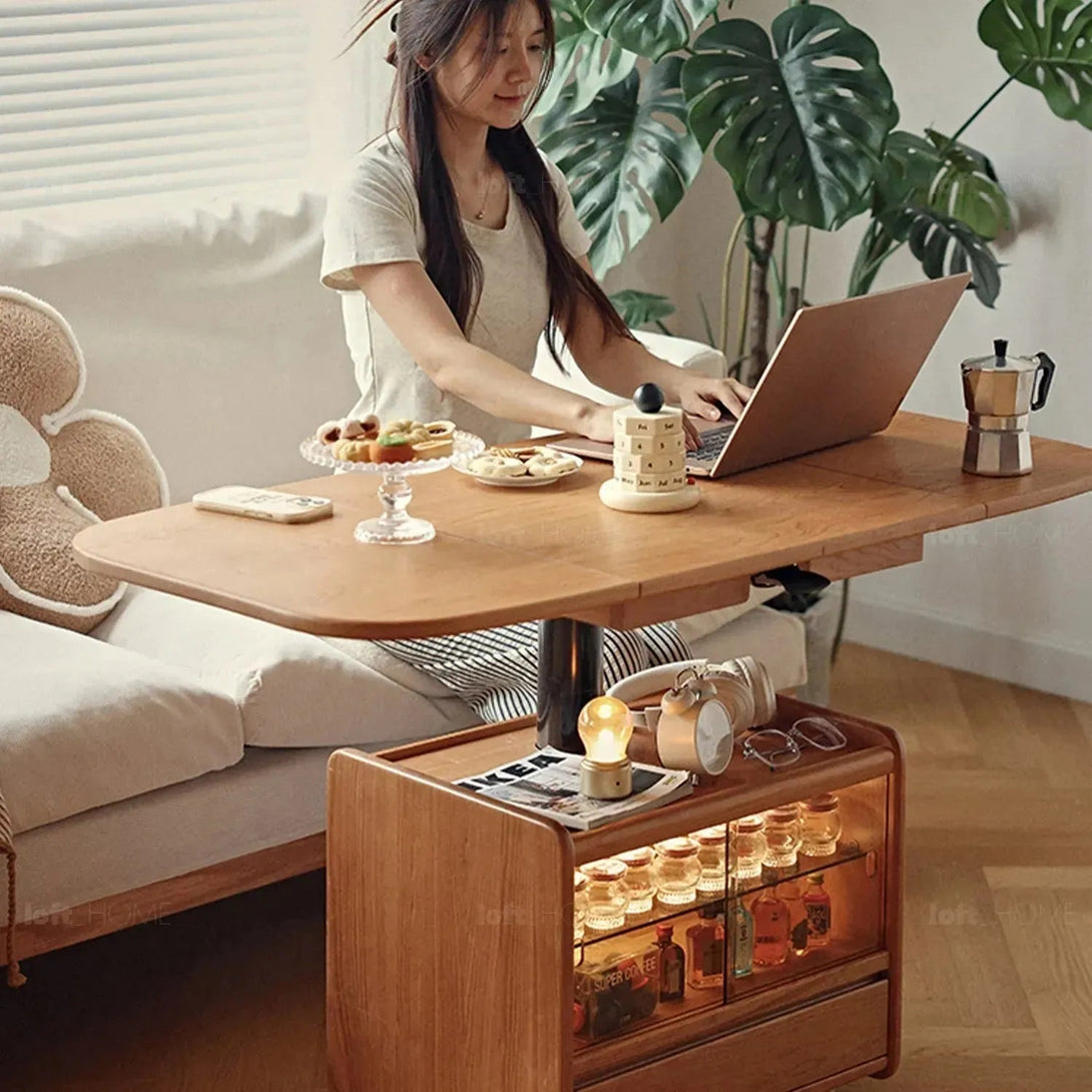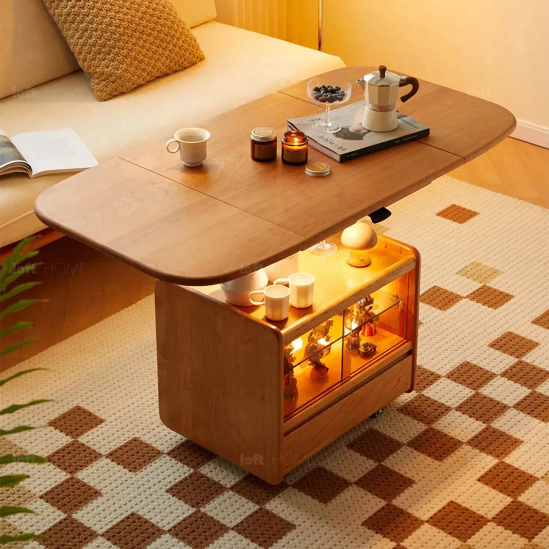 Scandinavian Cherry Wood Extendable Height Adjustable Coffee Table PUTTY features three configurations, adjustable height from 520mm to 730mm, and versatile storage areas. Crafted from premium cherry wood, it's perfect for any home, offering elegance and functionality in one stylish piece.