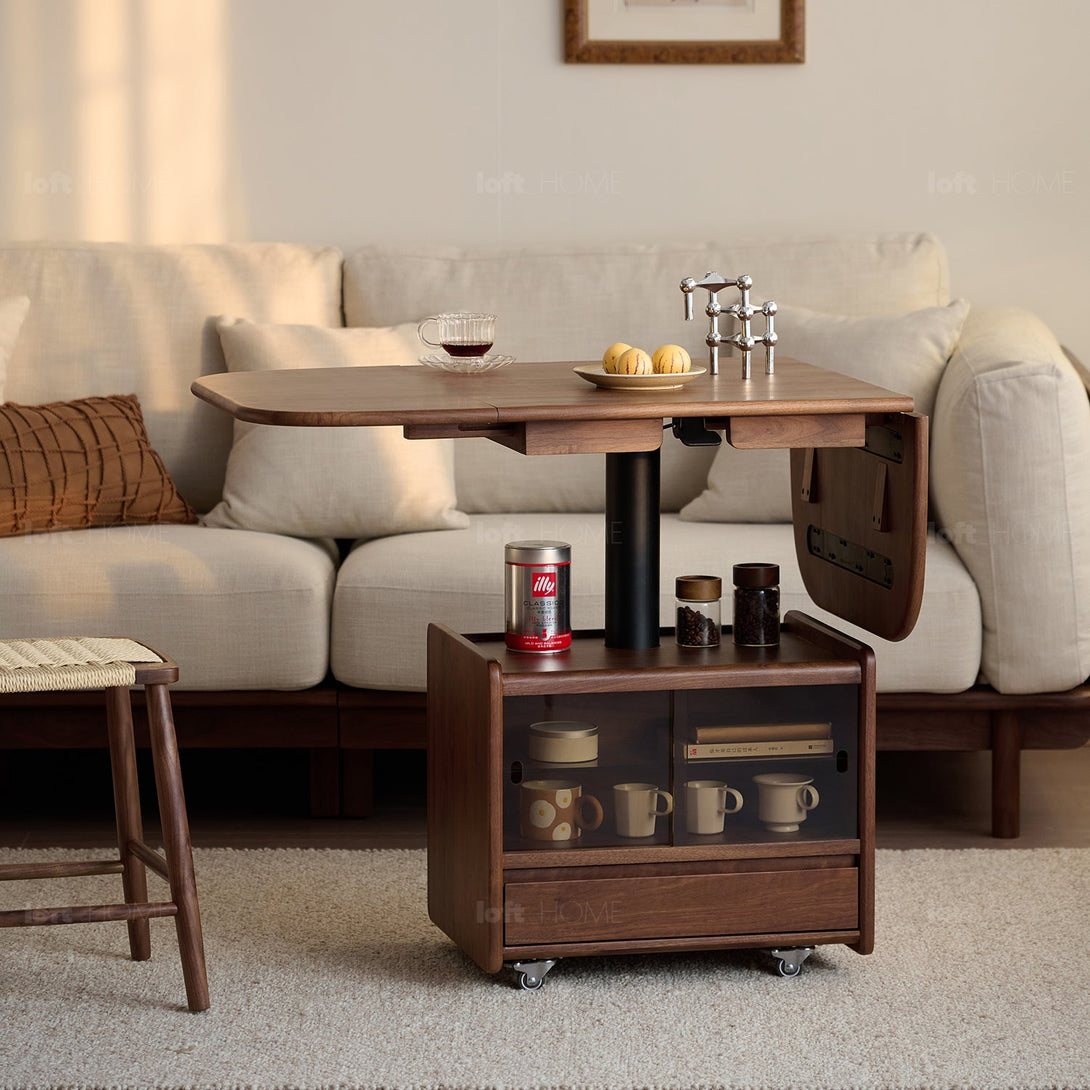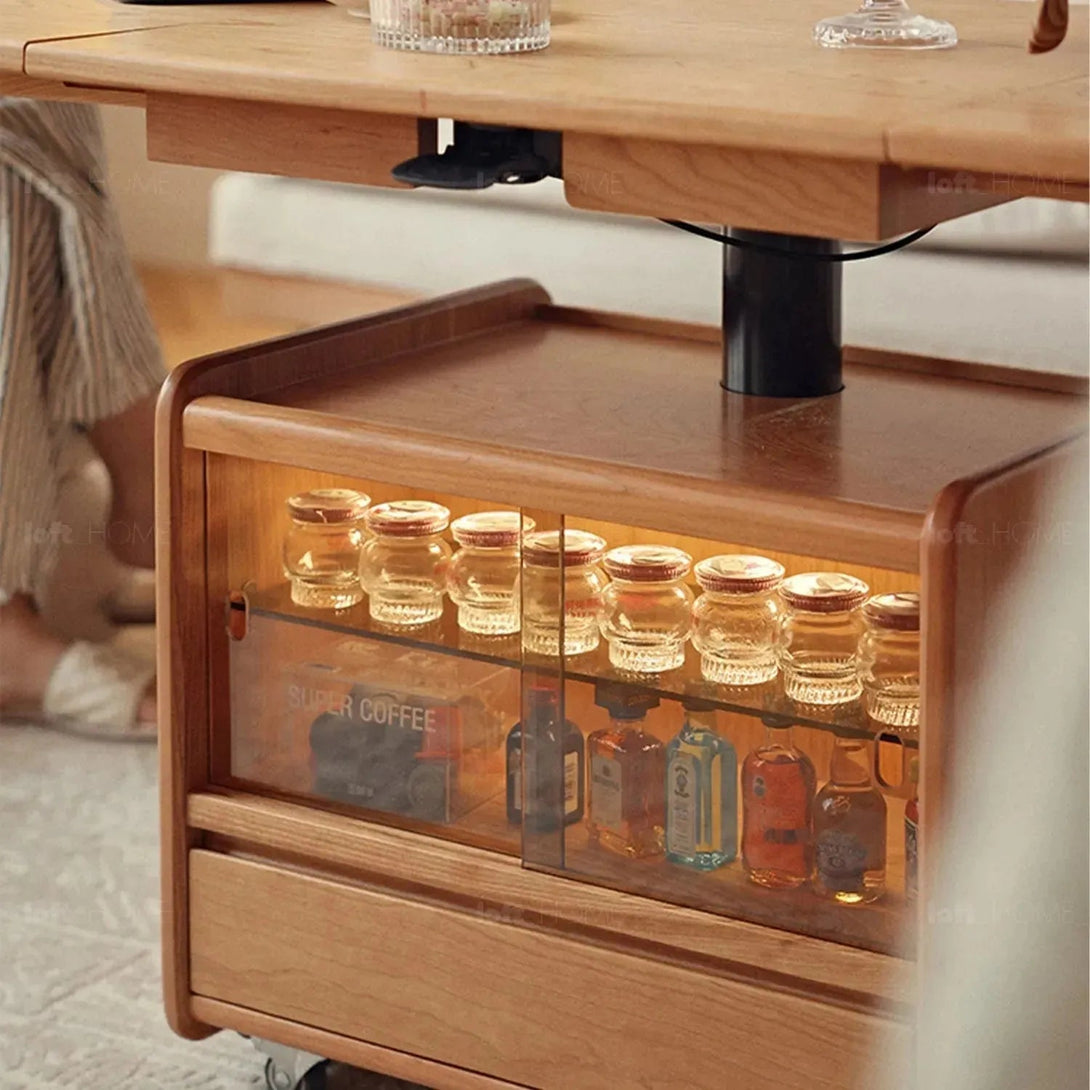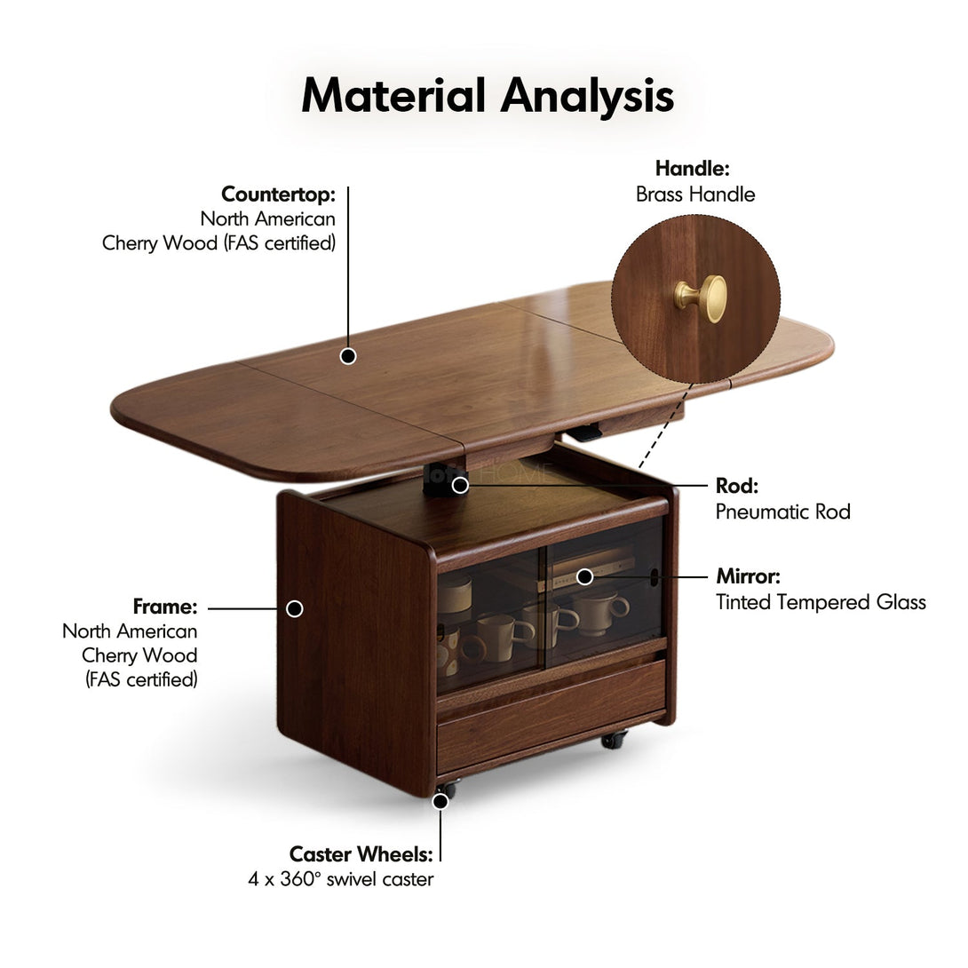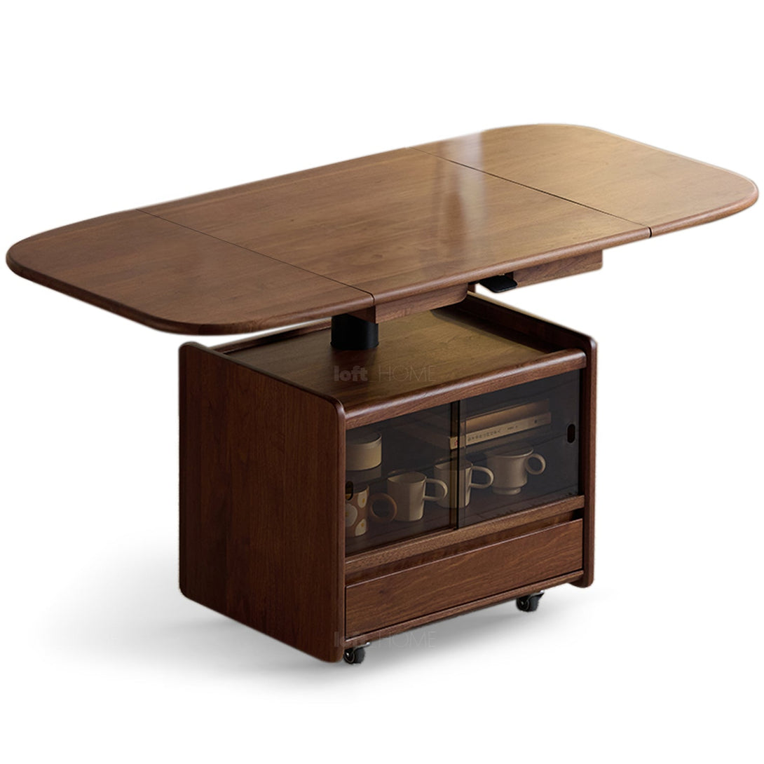 Scandinavian Cherry Wood Extendable Height Adjustable Coffee Table PUTTY features three configurations, adjustable height from 520mm to 730mm, and versatile storage areas. Crafted from premium cherry wood, it's perfect for any home, offering elegance and functionality in one stylish piece.