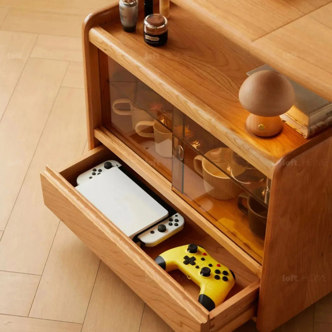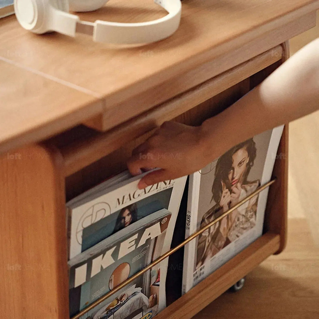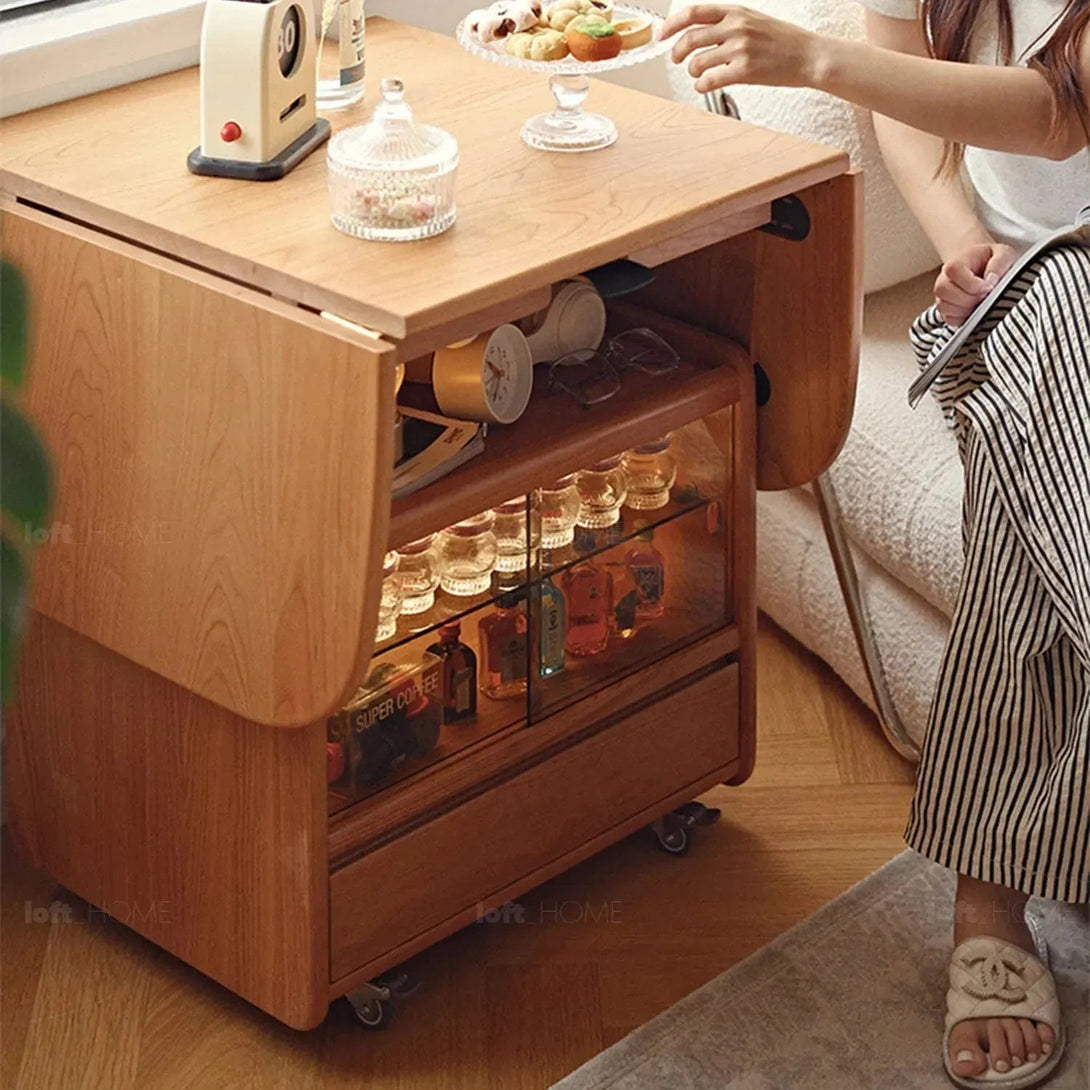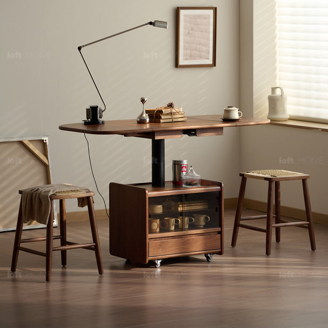 Scandinavian Cherry Wood Extendable Height Adjustable Coffee Table PUTTY features three configurations, adjustable height from 520mm to 730mm, and versatile storage areas. Crafted from premium cherry wood, it's perfect for any home, offering elegance and functionality in one stylish piece.