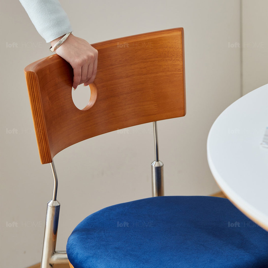 Scandinavian Cherry Wood Mix Weave Fabric Dining Chair TIMELESS blends mid-century charm with modern ergonomics, plush comfort, and a strong stainless steel frame—perfect for any refined space.