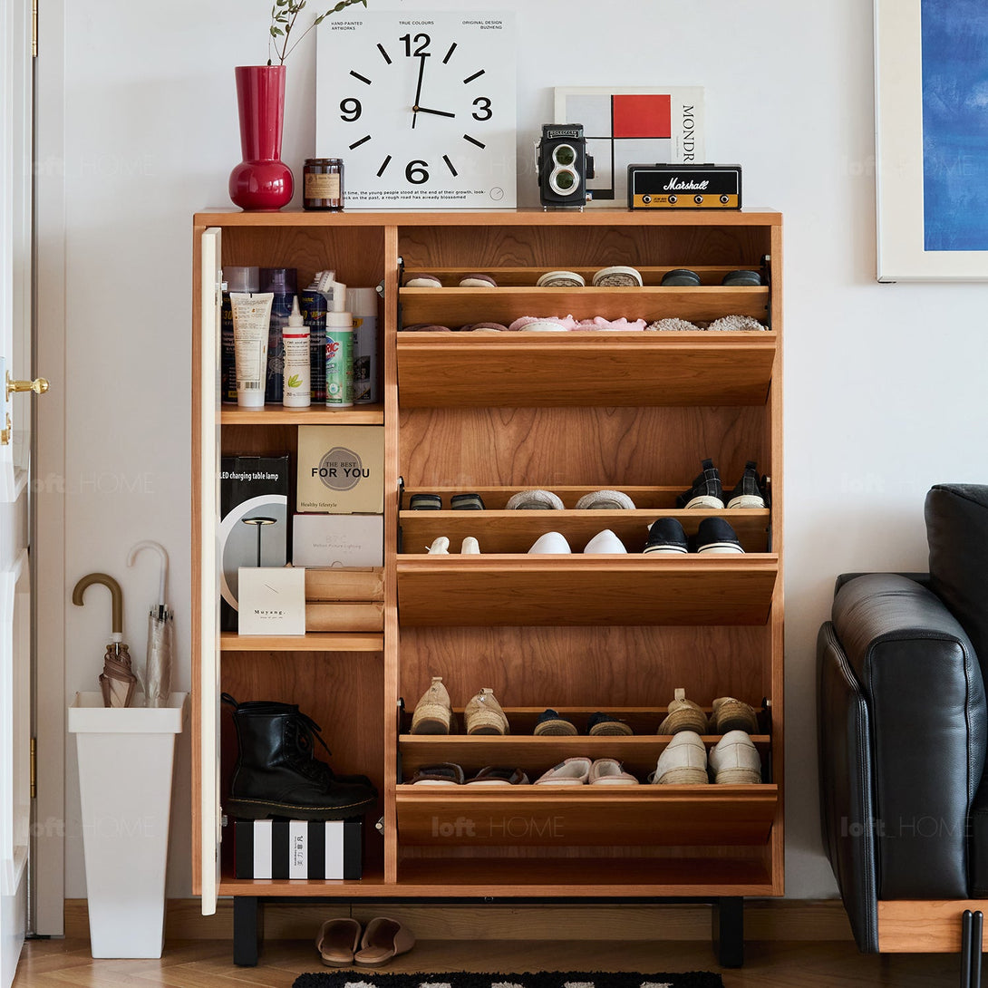 Scandinavian Cherry Wood Shoe Cabinet TIMELESS blends retro charm with smart flip-drawer zones, tall boot space, and a wall-hugging design perfect for compact homes.