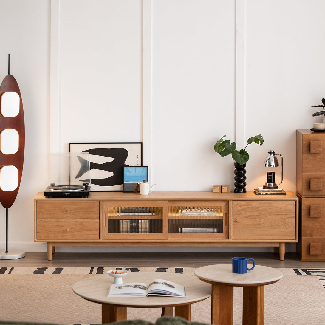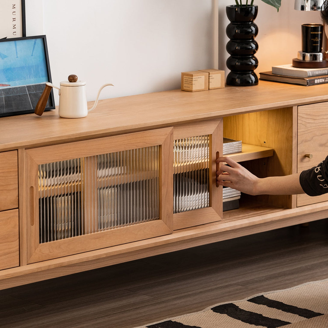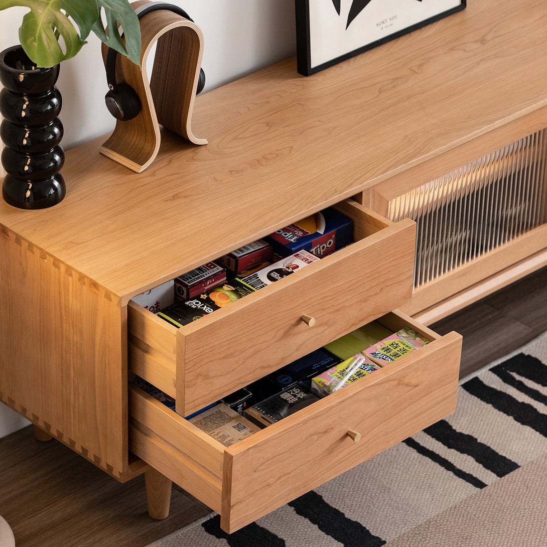 Bold style meets smart storage with the elegant Scandinavian Cherry Wood TV Console GREEN. Crafted from premium cherry wood with triple-zone function.
