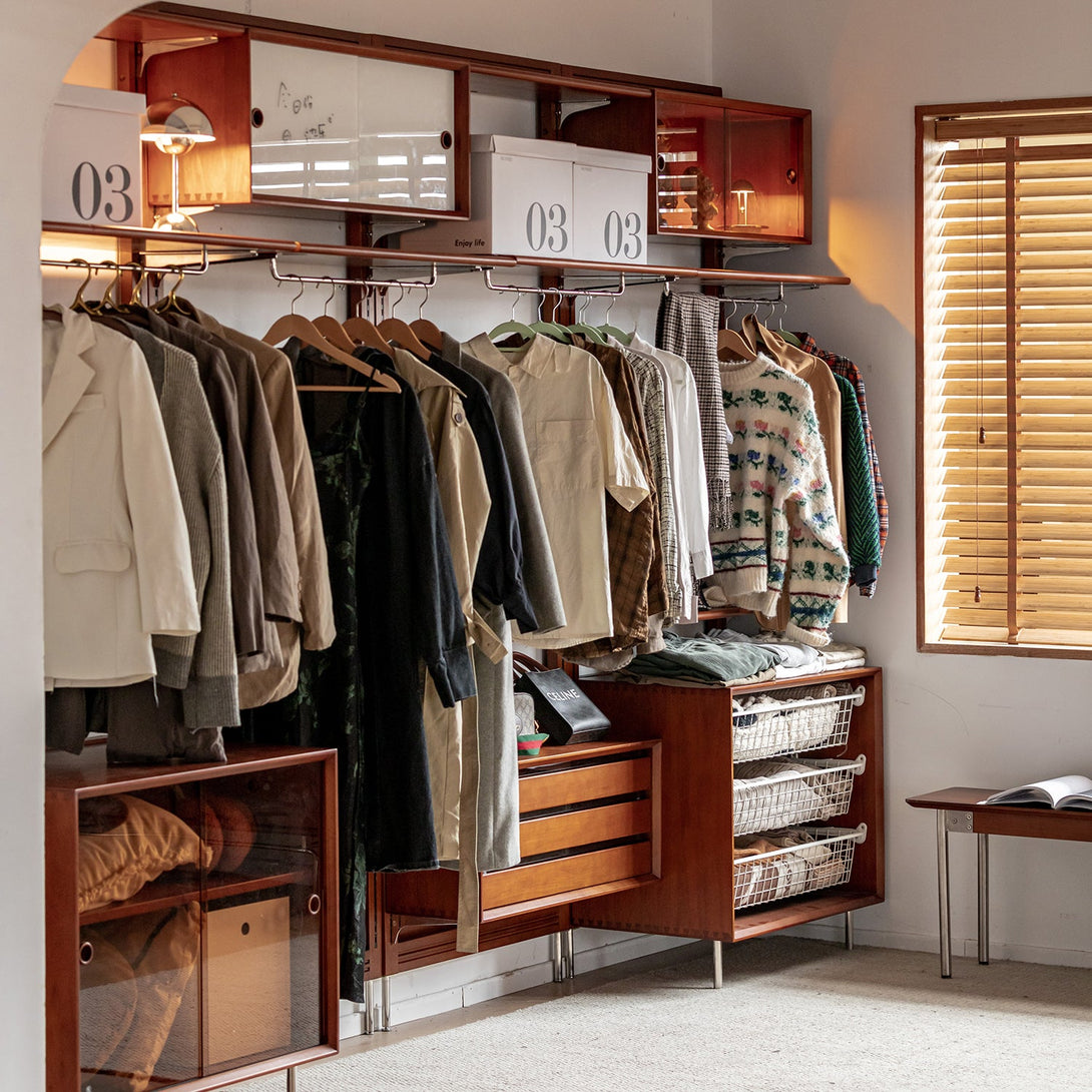 Vintage Boxwood Modular Hanging Wall Shelf System MUSE WARDROBE adapts to any room with adjustable modules, closet-friendly features, and smart vertical storage—designed for stylish everyday living.